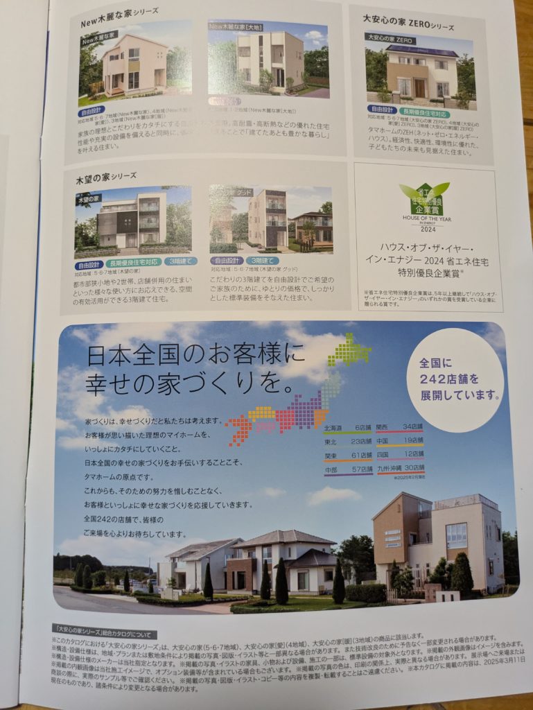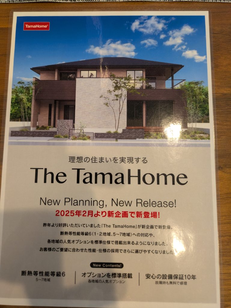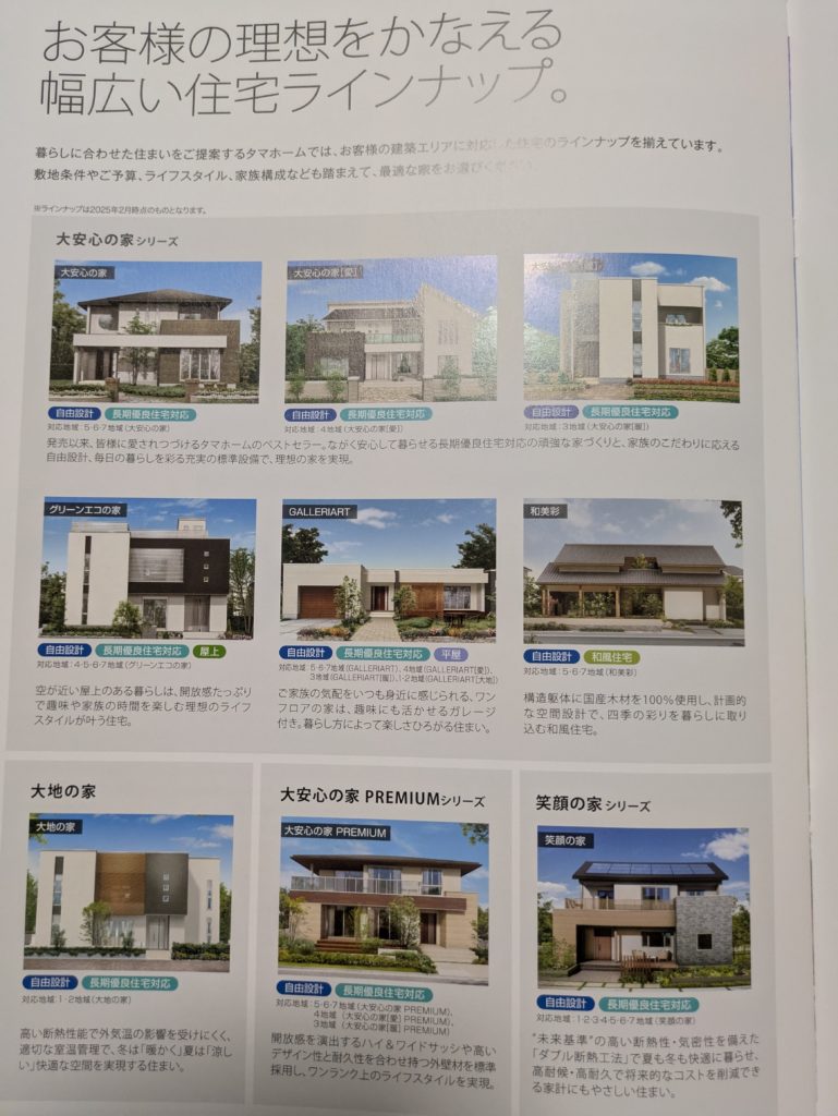 また。期間限定で「The TamaHome」って商品が25年2月から出てるらしいです。これは資材高騰を受けて、その都度仕入れやすい資材を使って大安心の家くらいの仕様を安く維持できるので、現状では一番オススメらしい。限定のものなので、ずっとあるかはわかるないけど、コスパは高そうです。