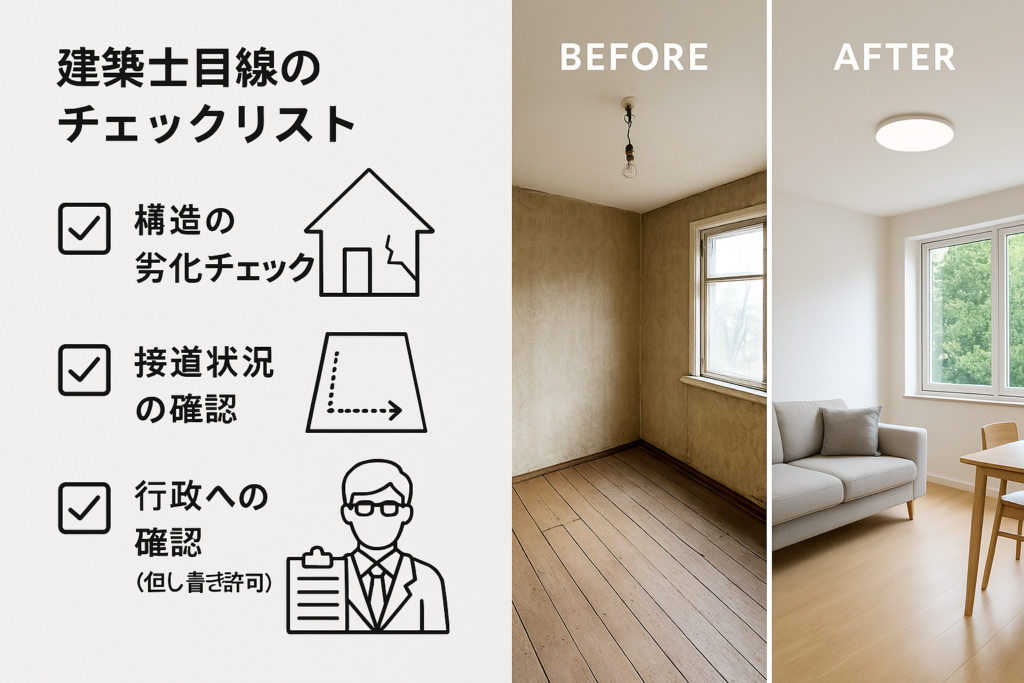 建築士の立場から、再建築不可物件を見るときに重要視するのは以下のポイントです: