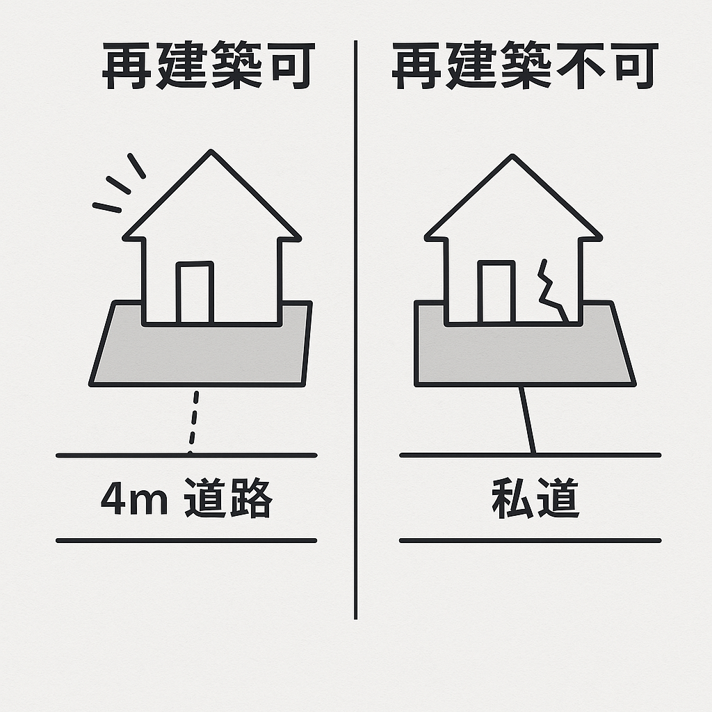 世田谷区のような古くからの住宅地では、幅の狭い私道や通路の奥に家が建っているケースが多く、こうした物件は「接道義務」を満たしていないため、再建築不可と判断されます。