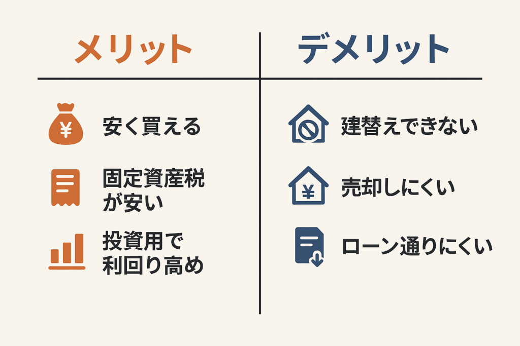 1. 価格が安い 再建築不可という制限があるため、同じ立地・面積でも相場より2〜3割、場合によっては半額程度で販売されていることもあります。